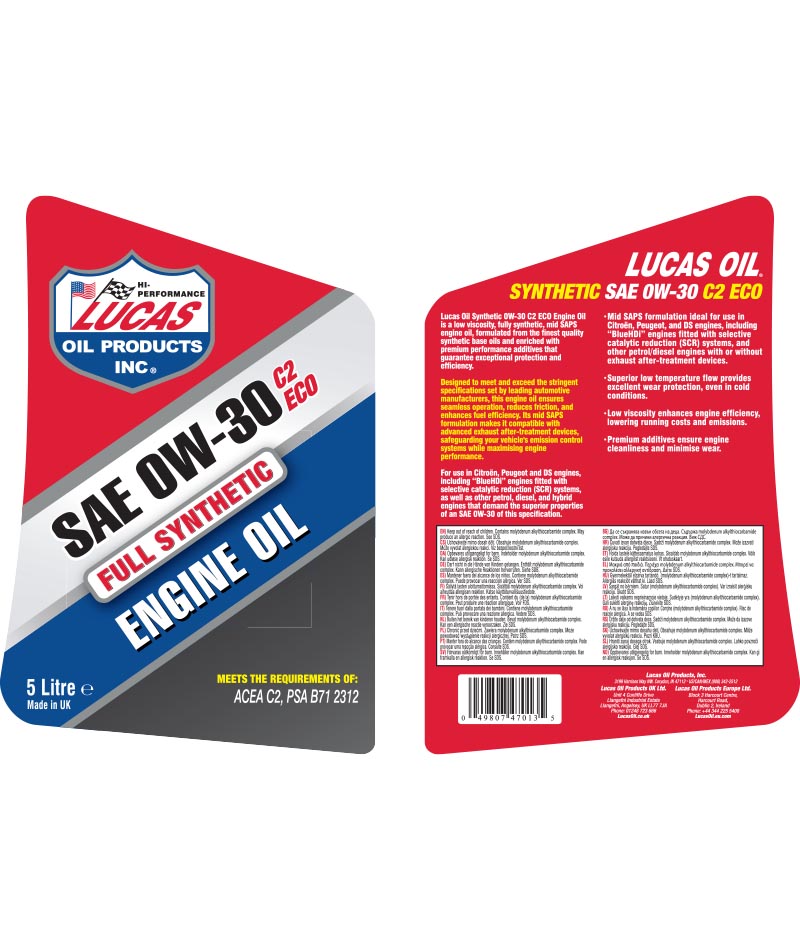 Lucas Oil Synthetic 0W-30 C2 ECO Engine Oil is a low viscosity, fully synthetic, mid SAPS engine oil, formulated from the finest quality synthetic base oils and enriched with premium performance additives that guarantee exceptional protection and efficiency.