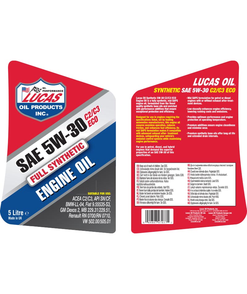 Lucas Oil Synthetic 5W-30 C2/C3 ECO Engine Oil is a fully synthetic, mid SAPS engine oil, formulated from the finest quality synthetic base oils and enriched with performance additives that ensure exceptional protection and efficiency.