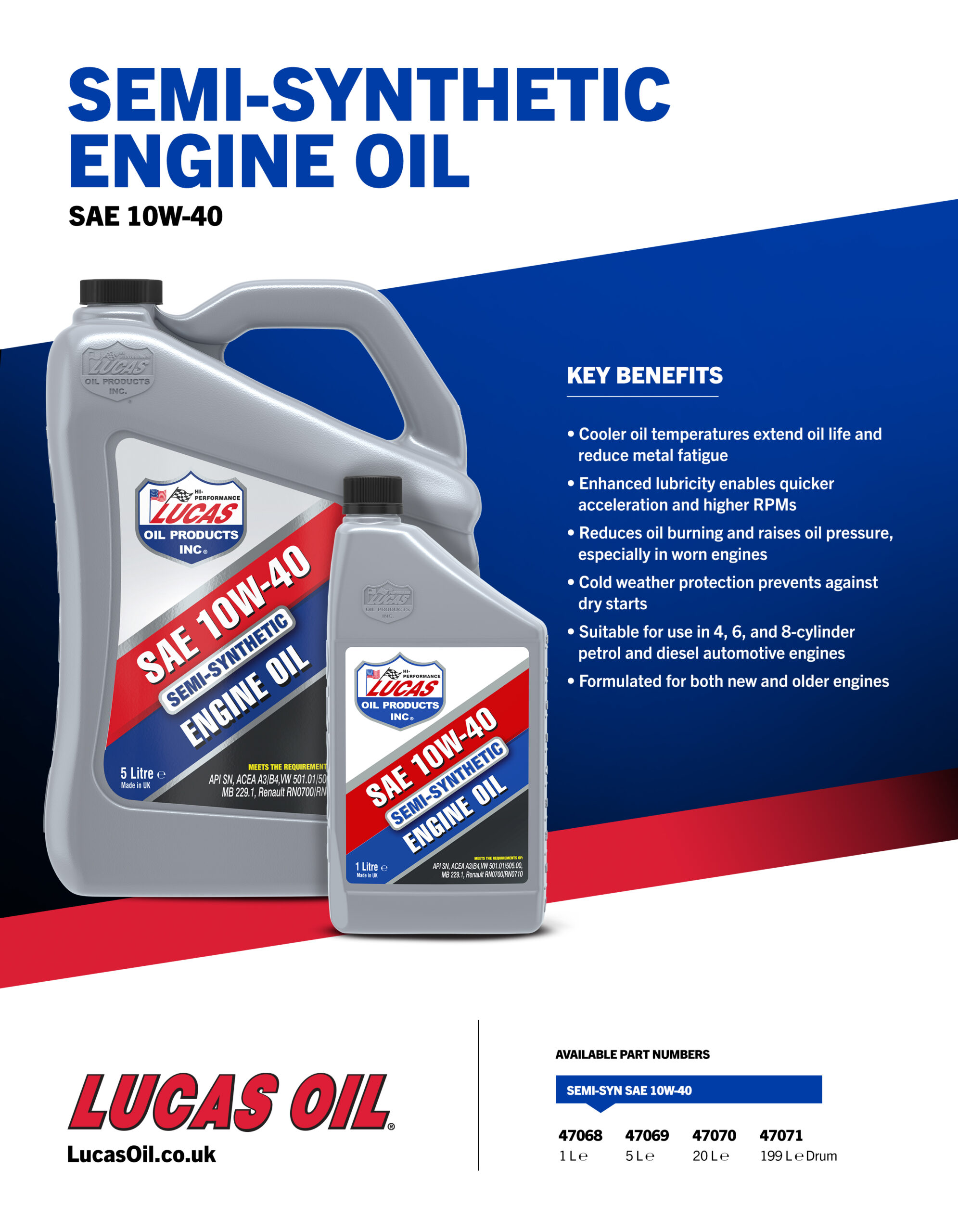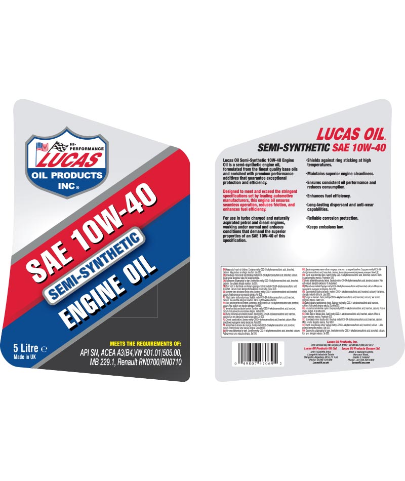 Lucas Oil Semi-Synthetic 10W-40 Engine Oil is a semi-synthetic engine oil, formulated from the finest quality base oils and enriched with premium performance additives that guarantee exceptional protection and efficiency.